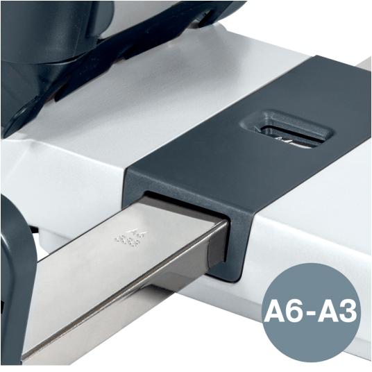 - posiada metalowy, precyzyjny ogranicznik formatu oraz specjalne zabezpieczenie gwarantujące bezpieczną pracę