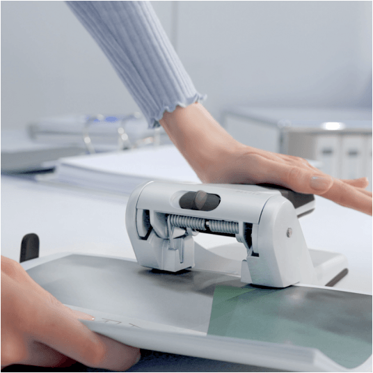 - blokada ramienia pozwala przechowywać dziurkacz z maksymalnie obniżonym ramieniem